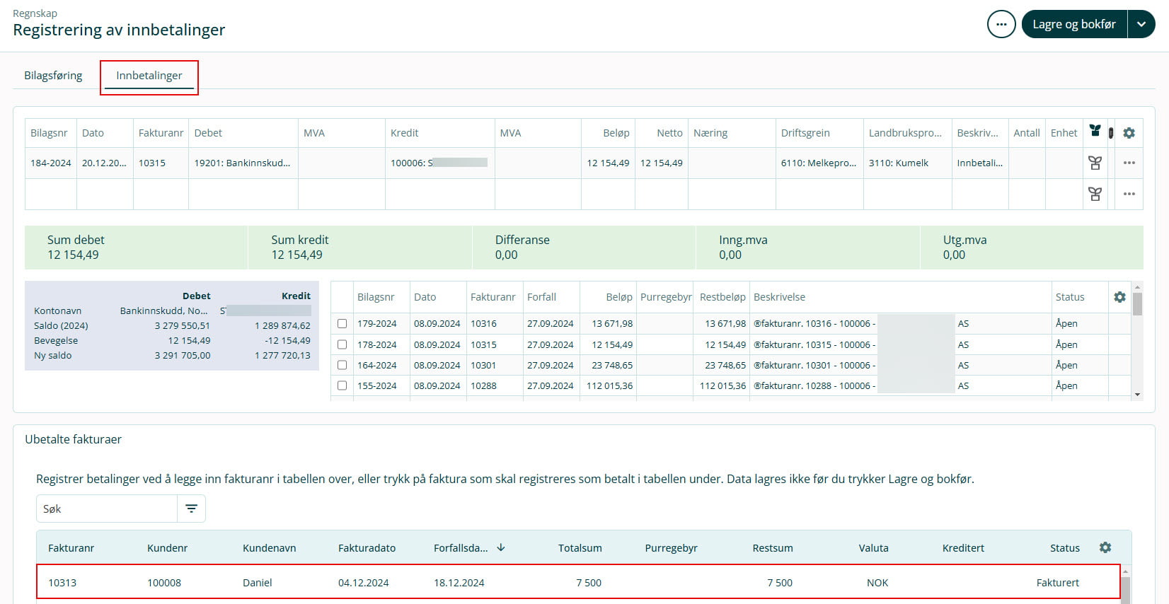 Klikker du på fanen Innbetalinger vil du se alle poster som er åpne i reskontro. Du kan klikke direkte på en faktura, og aktuelle felter vil fylles ut.