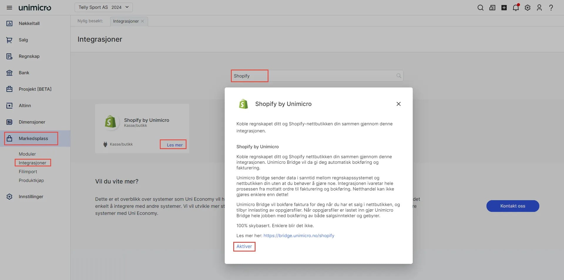 3. Velg Shopify by Unimicro ved å klikke på Les mer.
