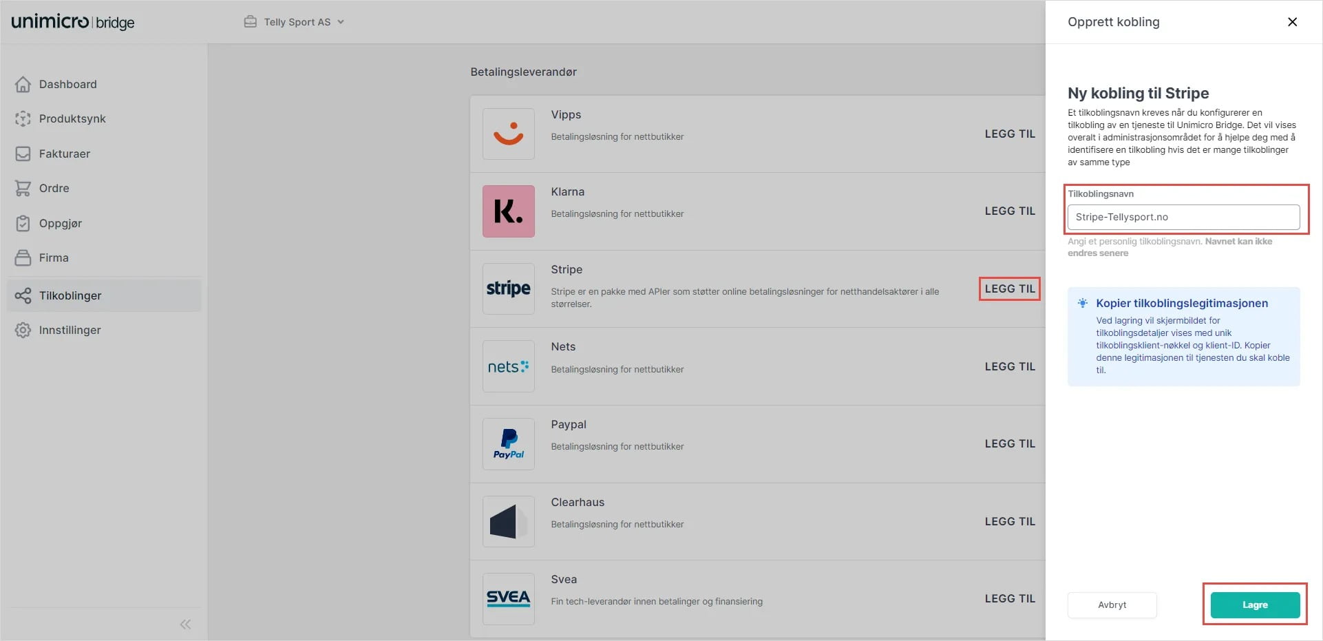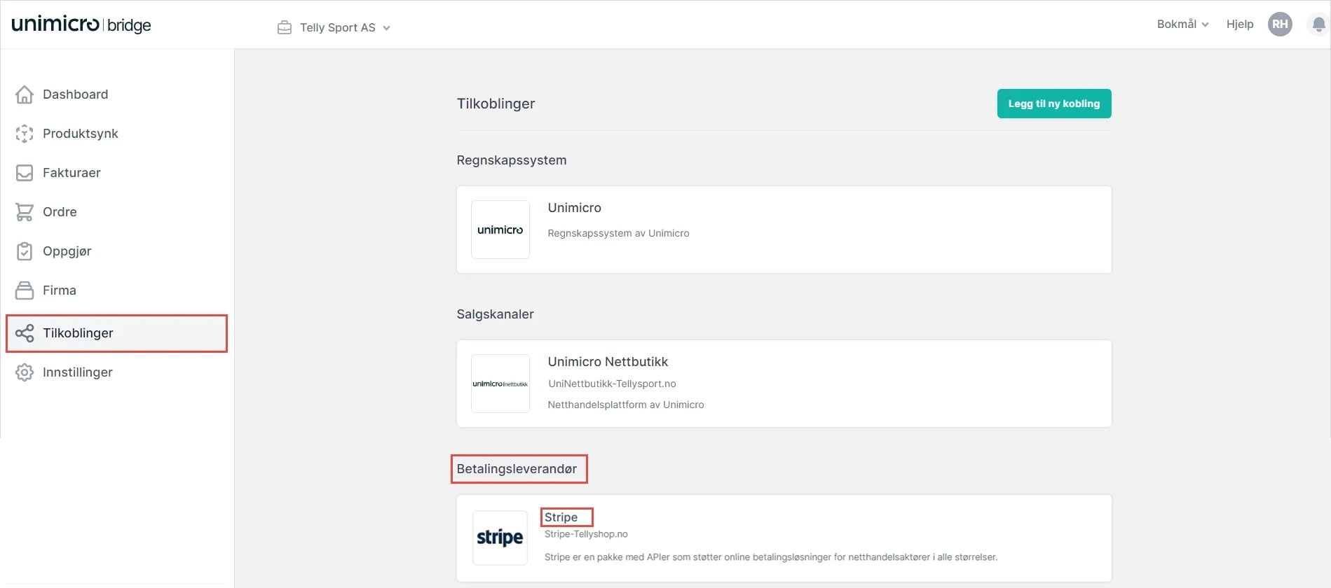 6. Din Stripe-tilkobling er nå tilgjengelig under Tilkoblinger og Betalingsleverandør. Klikk på Stripe-tilkoblingen.