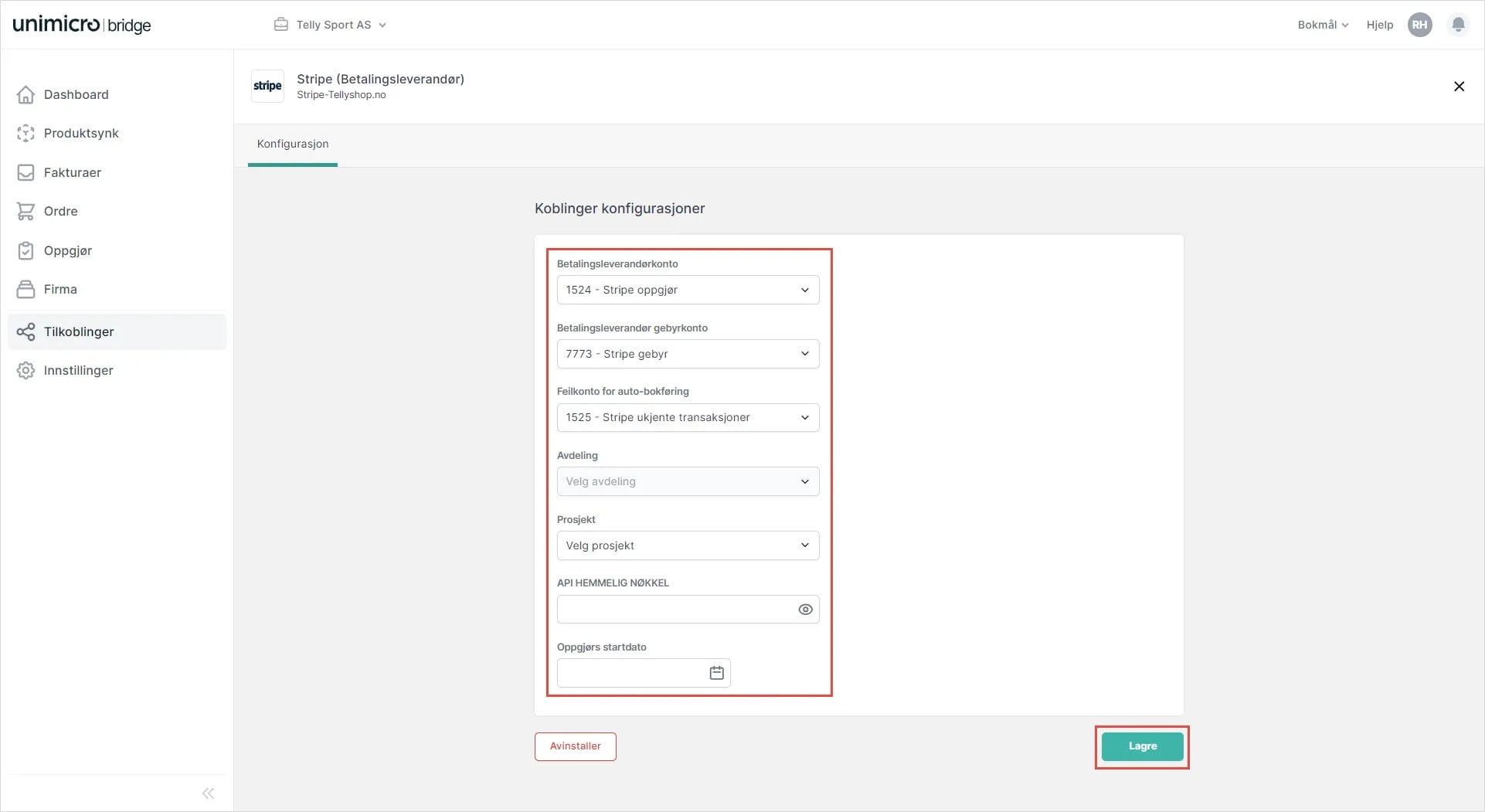 Dette er Stripe sin API-nøkkel. Stripe sin API-nøkkel henter du inne på Stripe sin portal. - Oppgjørs startdato: