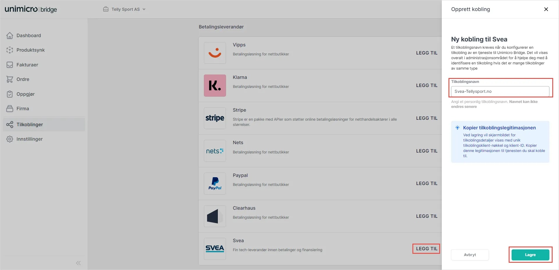 6. Din Svea-tilkobling er nå tilgjengelig under Tilkoblinger og Betalingsleverandør. Klikk på Svea-tilkoblingen.