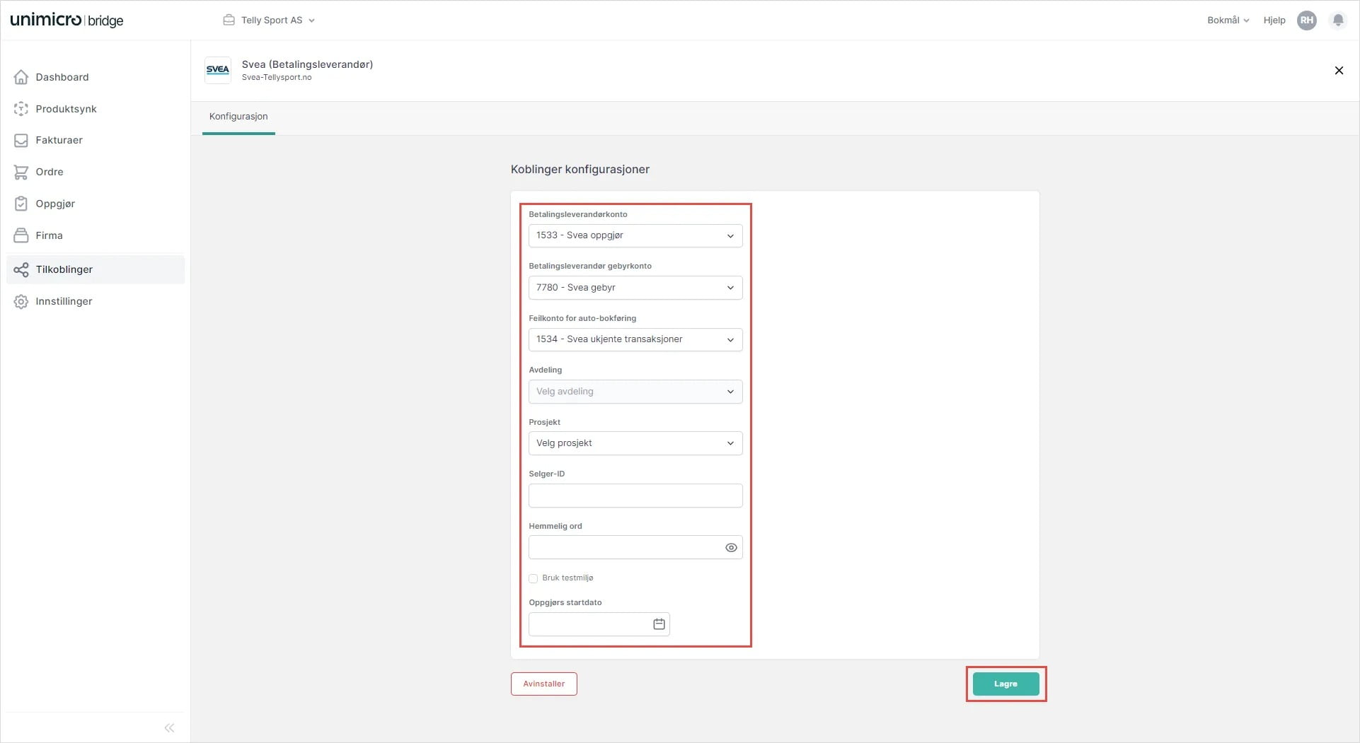 8. Klikk på Lagre og Unimicro Bridge vil automatisk bokføre oppgjør fra registrert startdato.