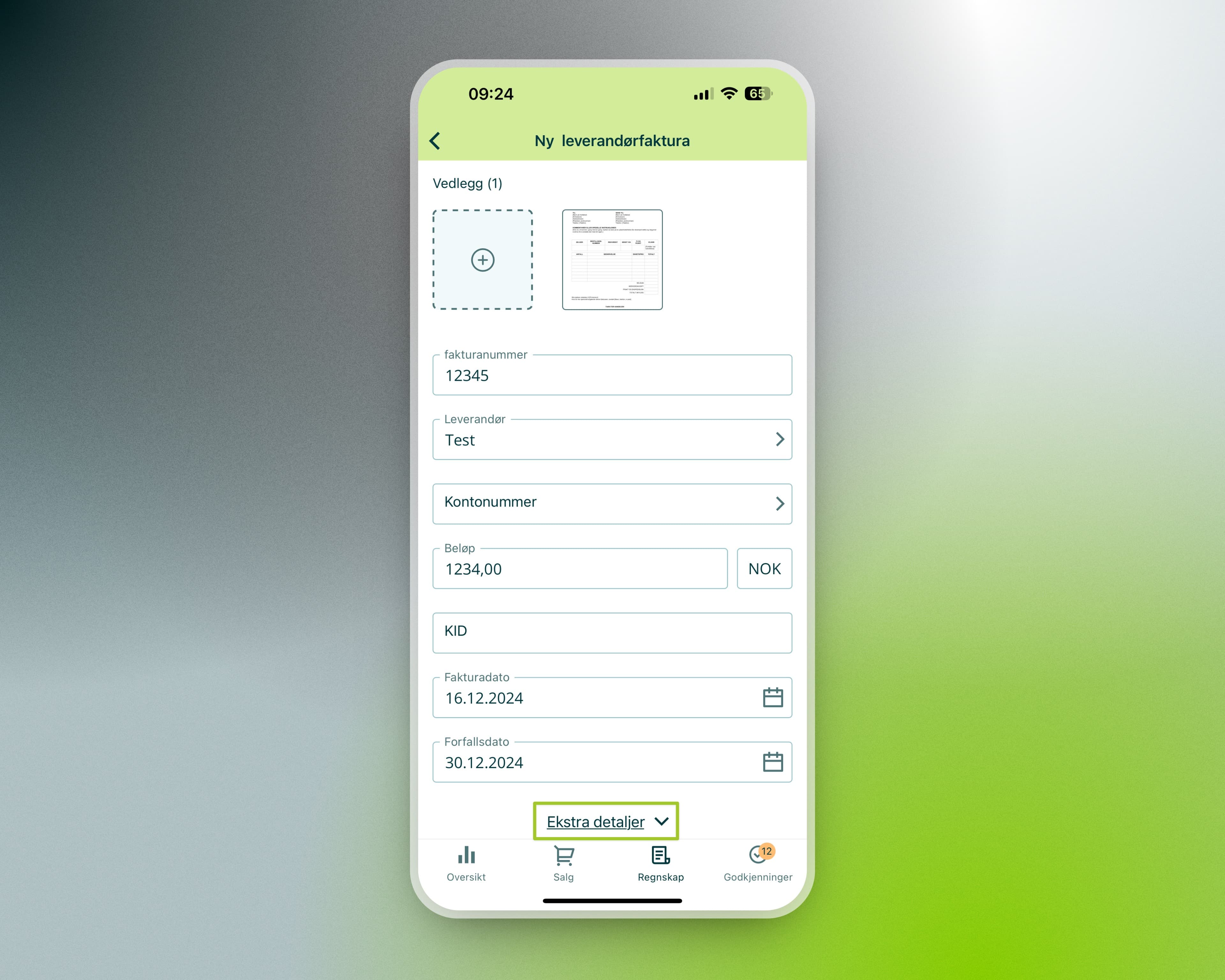 4. Du kan nå fylle ut fakturanummer, leverandør, kontonummer, beløp, KID, fakturadato og forfallsdato. Ønsker du å legge inn prosjekt, avdeling eller andre dimensjoner, finner du dette under Ekstra detaljer. Hvis du har aktivert fakturatolk (OCR-scanning) vil du få spørsmål om du ønsker at tolken skal fylle ut feltene for deg for raskere behandling. Informasjonen som fakturatolken legger inn, kan endres ved behov. Finnes ikke leverandøren fra før, får du anledning til å opprette ny leverandør direkte i dette bildet.
