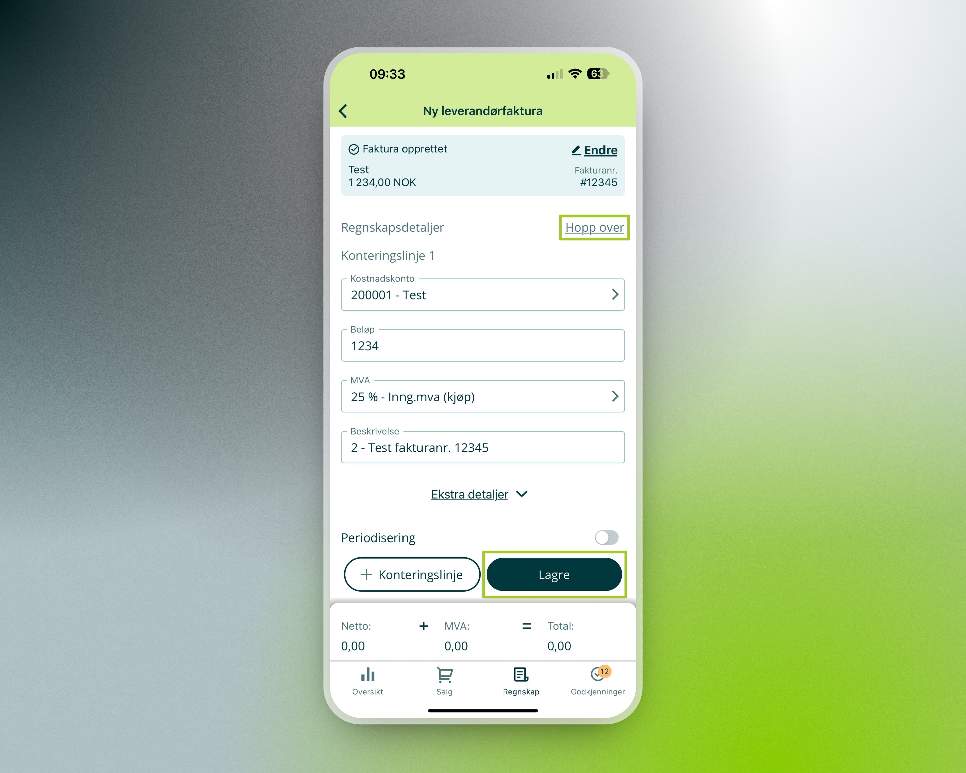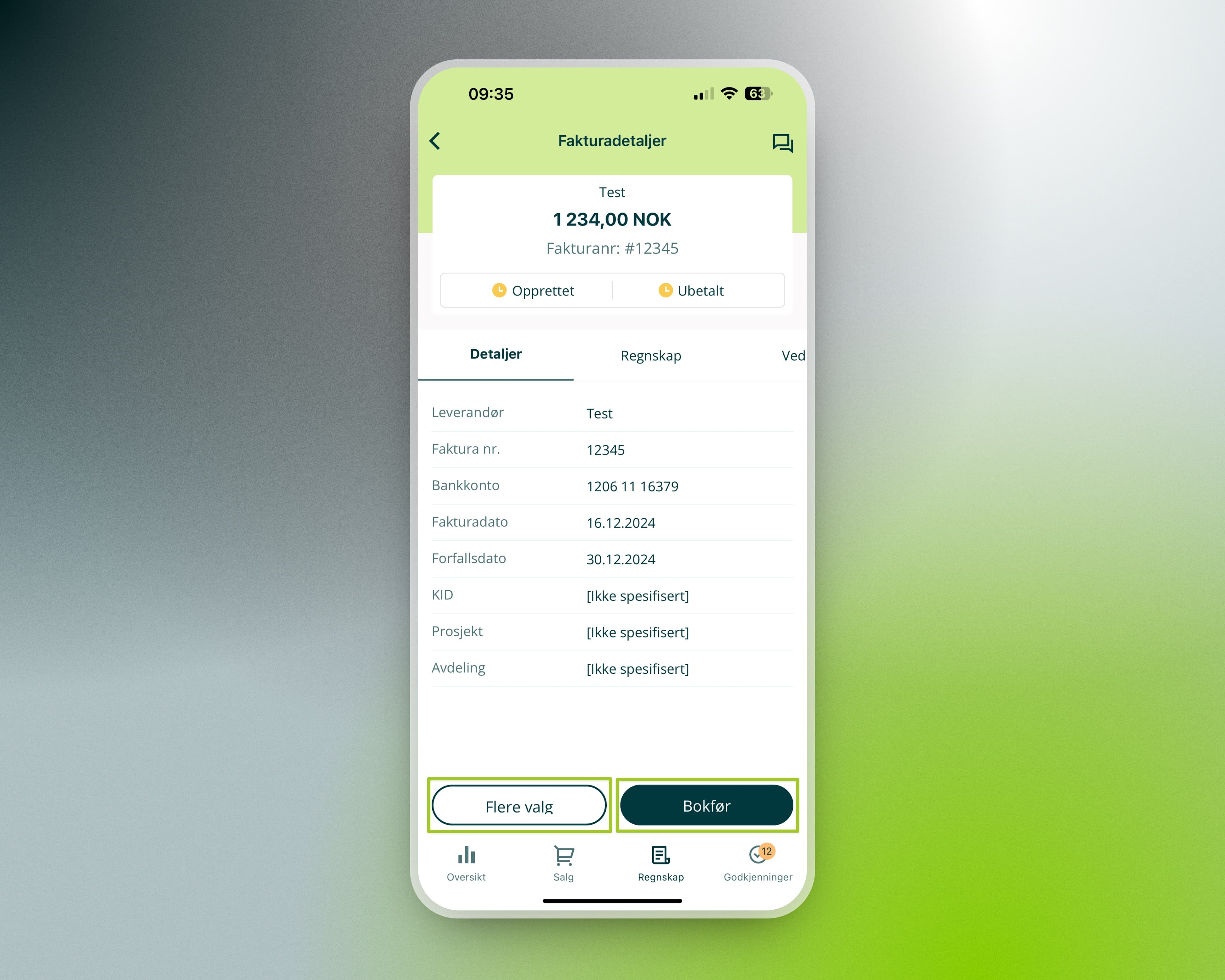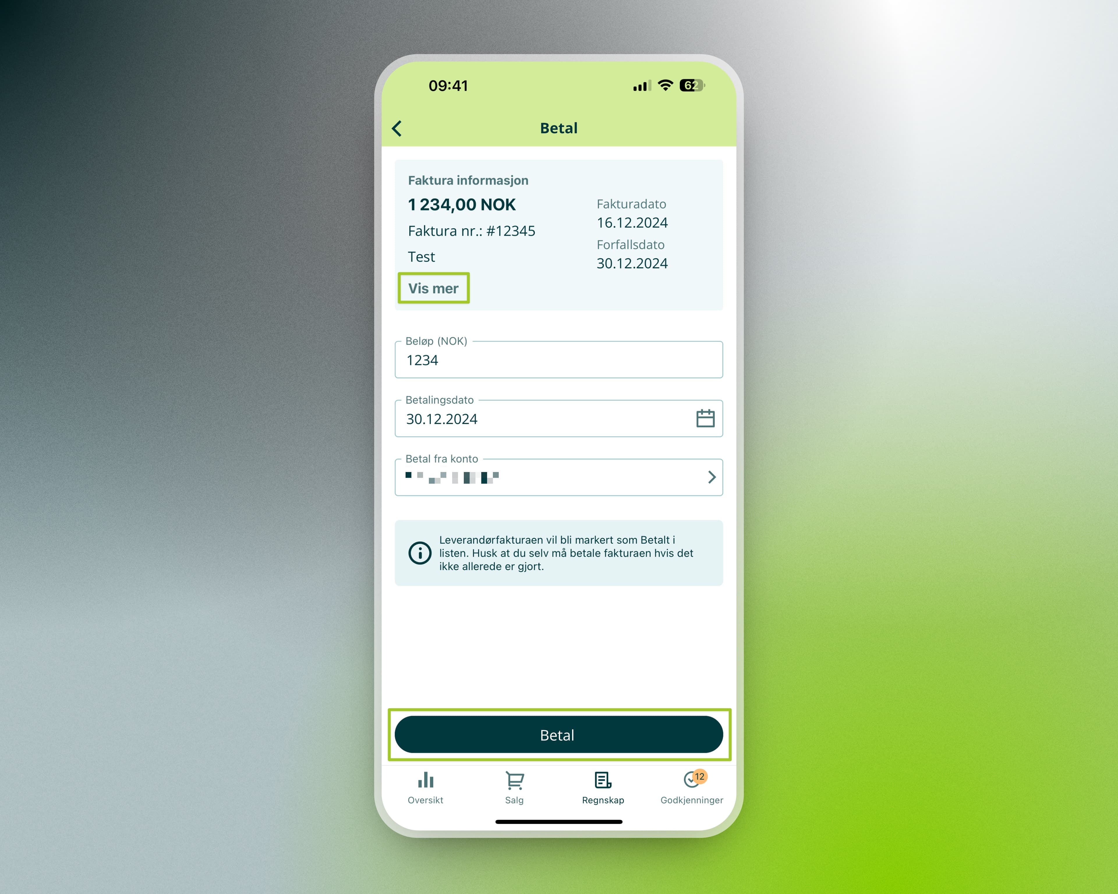 For å kunne betale en faktura fra appen, må selskapet ha kobling mot bank i regnskapet, og din bruker må ha nødvendige tilganger. Her viser vi deg hvordan du betaler en helt ny faktura som ligger i innboksen.