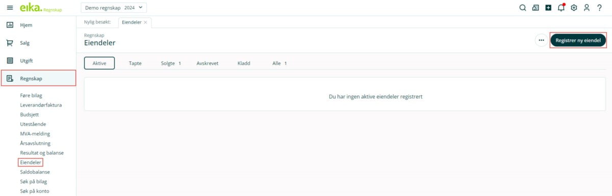 1. Gå til Regnskap i venstremenyen og velg Eiendeler.