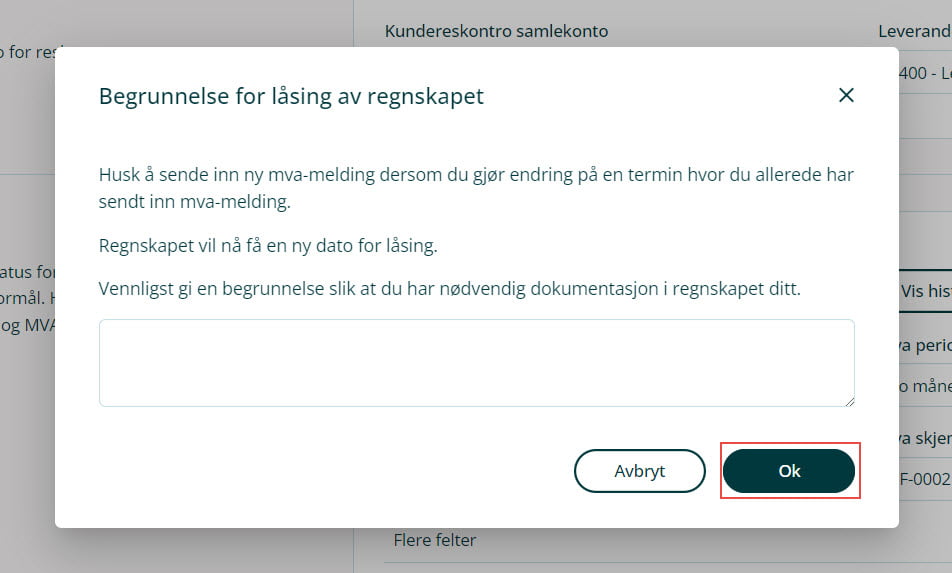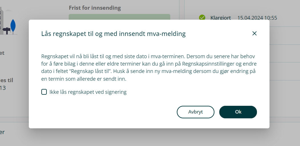 Når du sender mva-meldingen til Altinn og signerer eller godkjenner den manuelt, vil du få et dialogvindu som lar deg låse regnskapet til og med perioden for innsendt mva-melding. Klikker du OK, vil systemet låse denne perioden. Hvis du ikke ønsker å låse, kan du sette hake ved ☑ Ikke lås regnskapet ved signering.