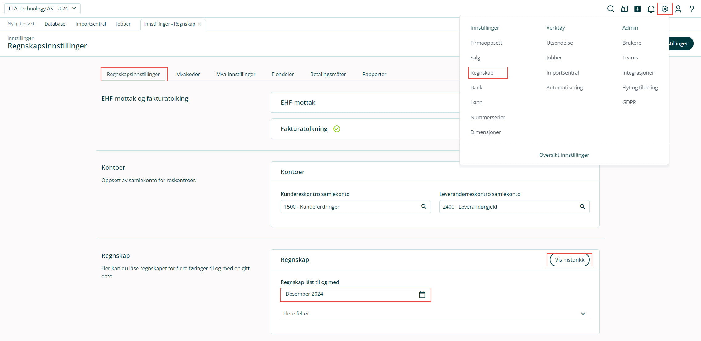 1. Gå til ⚙ Innstillinger i toppmenyen og velg Regnskap. Under Regnskapsinnstillinger og feltet Regnskap ser du om regnskapet er låst, og for hvilken periode. Du kan også manuelt velge en annen periode for låsing ved å angi en dato i feltet Regnskap låst til og med.