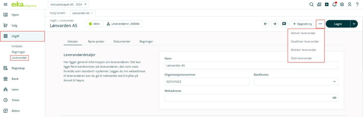 For å endre informasjonen om en leverandør, klikker du på de tre kulepunktene på leverandørens profil. Her finner du fire alternativer for å håndtere leverandøren.
