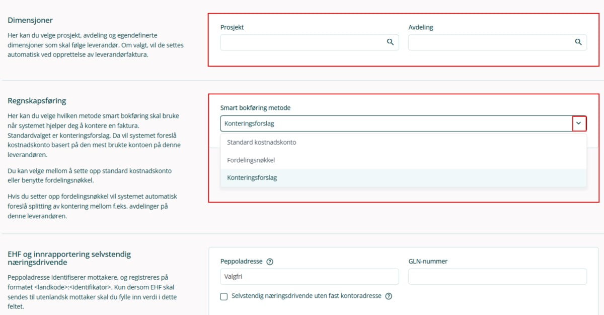 8. Ved feltet Regnskapsføring kan du velge mellom ulike metoder som smart bokføring skal bruke på en inngående faktura som opprettes. Som standard er Konteringsforslag valgt. Med konteringsforslag vil systemet foreslå kostnadskonto basert på den mest brukte kontoen på aktuell leverandør. Du kan også velge å angi standard kostnadskonto eller fordelingsnøkkel som metode.