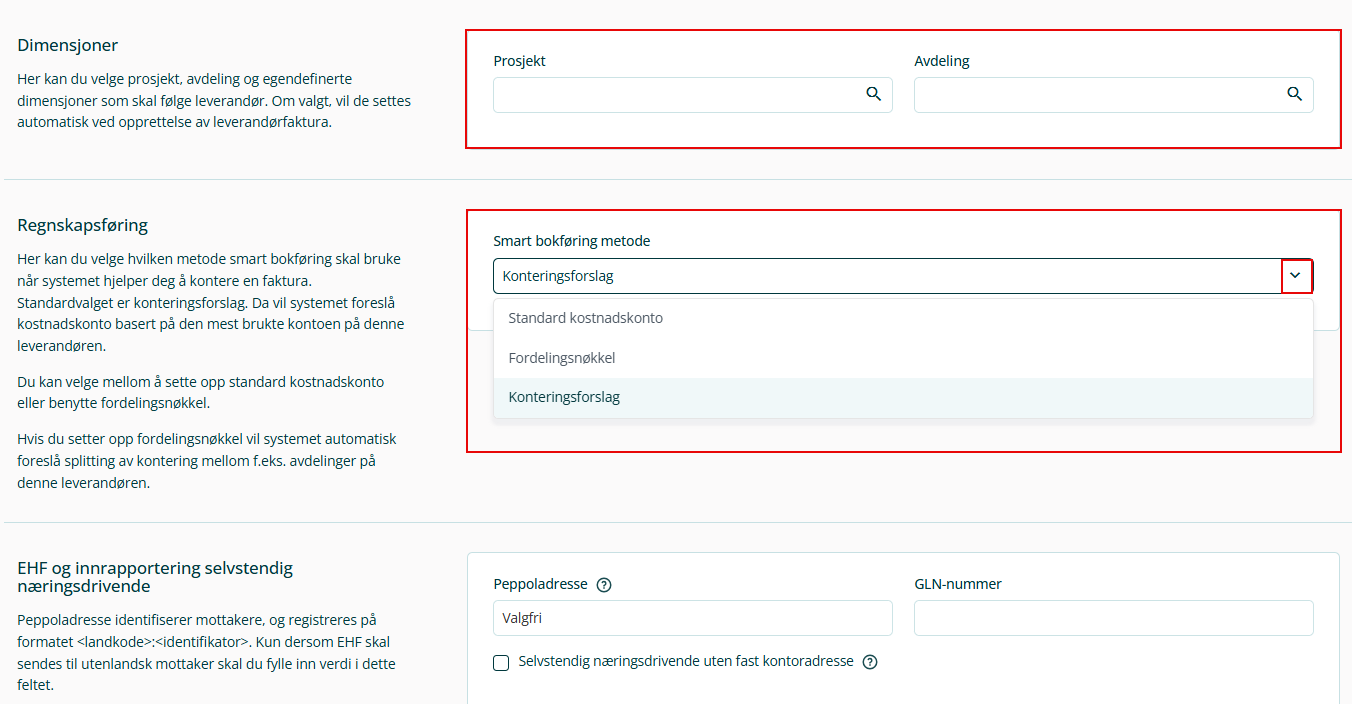 8. Ved feltet Regnskapsføring kan du velge mellom ulike metoder som smart bokføring skal bruke på en inngående faktura som opprettes. Som standard er Konteringsforslag valgt. Med konteringsforslag vil systemet foreslå kostnadskonto basert på den mest brukte kontoen på aktuell leverandør. Du kan også velge å angi standard kostnadskonto eller fordelingsnøkkel som metode.