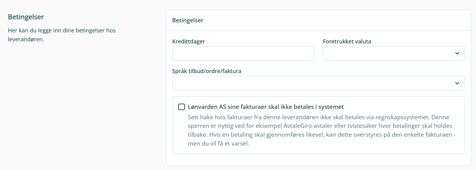 3. Søk opp leverandøren i 1880/Brønnøysundregistrene for å hente inn opplysninger. Du kan også legge inn informasjonen manuelt i feltene under. Klikk på Lagre. Da kommer du til en oversikt hvor du kan legge inn flere opplysninger.