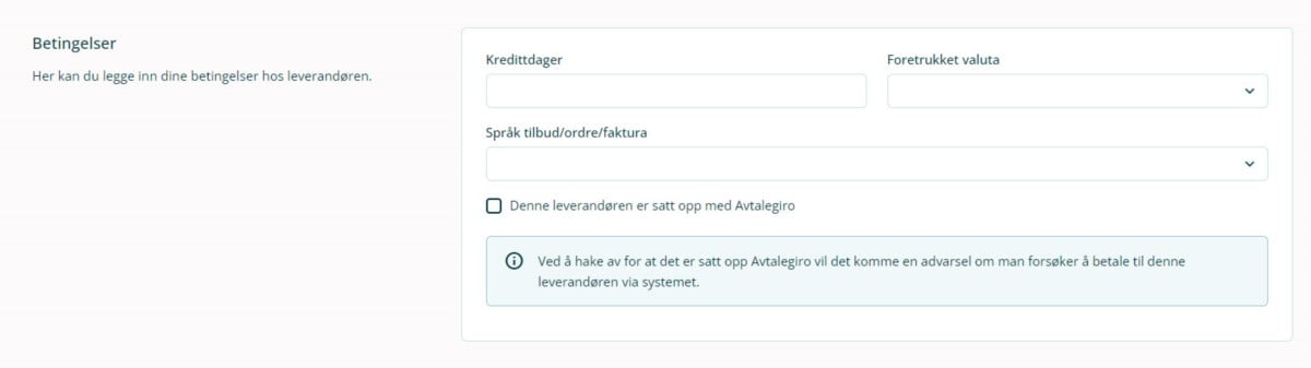 Hvis du ønsker å betale leverandøren via Avtalegiro, setter du hake ved ☑ Denne leverandøren er satt opp med Avtalegiro. Hvis du har satt hake for dette, og du senere forsøker å legge en faktura fra denne leverandøren til betaling, vil du få en advarsel om at leverandøren er satt opp med Avtalegiro. Du kan likevel velge å betale fakturaen hvis du ønsker det.