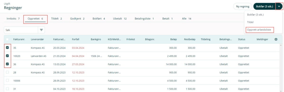 Du kan også lage arbeidslister under de andre fanene i oversiktsbildet for Leverandørfaktura. Da klikker du på pilen til høyre velger Opprett arbeidsliste.