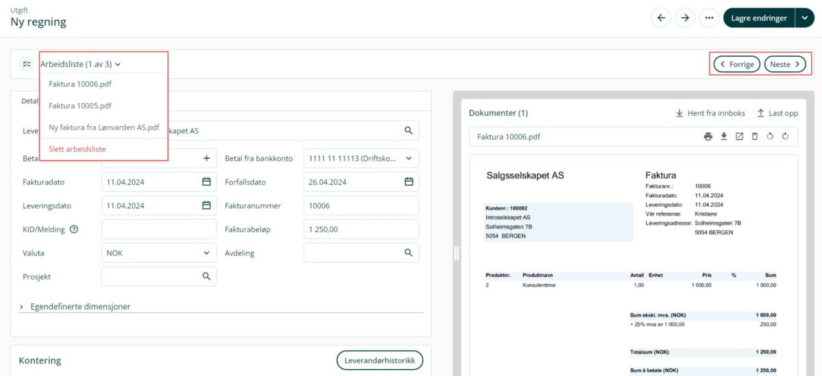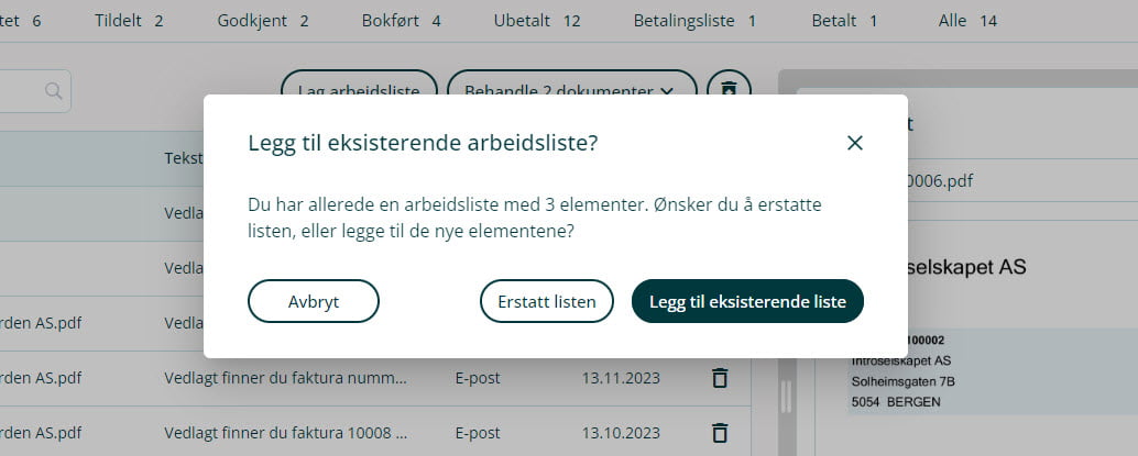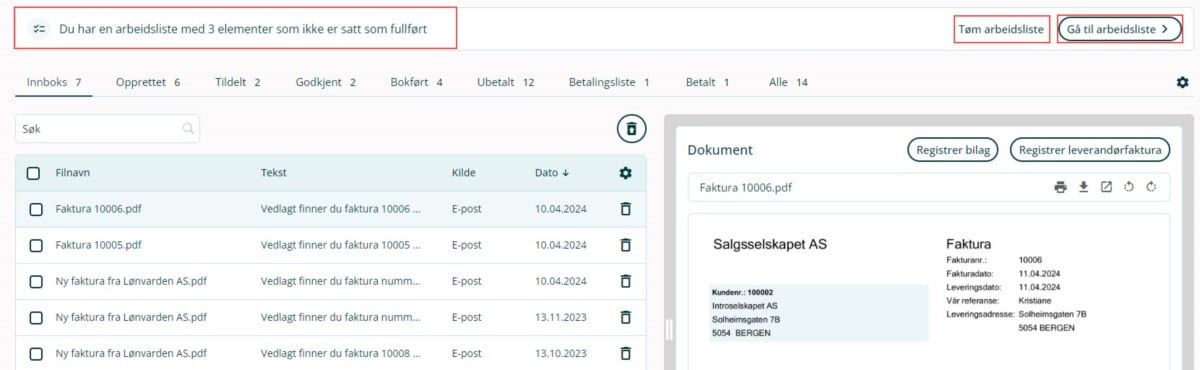 4. Hvis du forlater arbeidslisten, vil du senere finne et informasjonsbanner i oversiktsbildet til Leverandørfaktura som lar deg gå tilbake til listen. Her kan du også slette alle filene fra listen ved å velge Tøm arbeidsliste.
