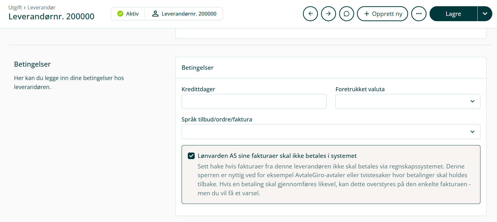 2. Bla ned til feltet Betingelser og sett hake ved ☑ xxxx sine fakturaer skal ikke betales via systemet.