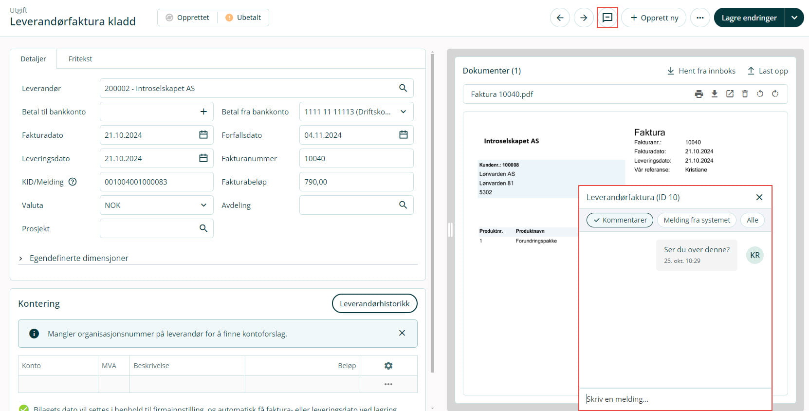 Slik bruker du kommentarfunksjon i leverandørfaktura