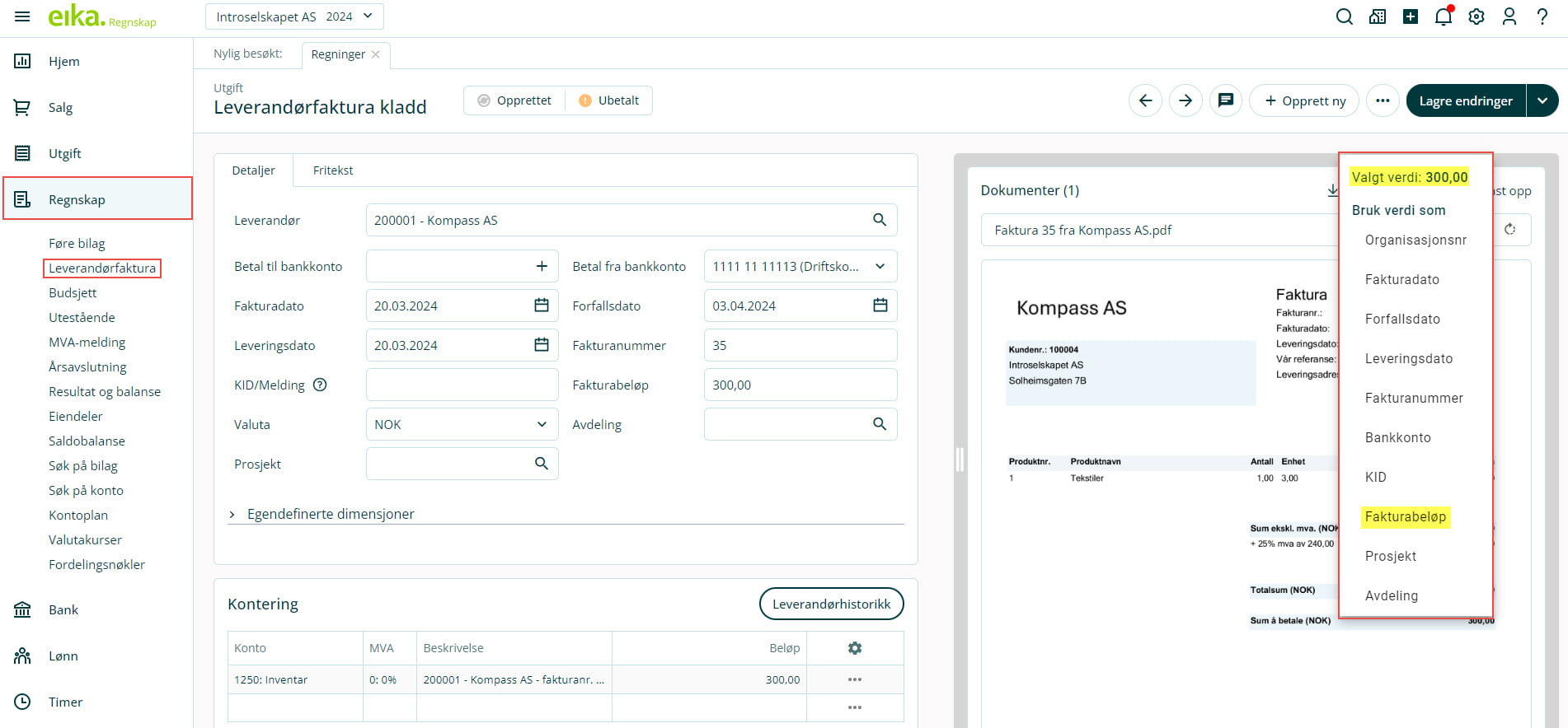 Tolken husker nå dette feltet og skal i utgangspunktet bruke Sum å betale som verdi Fakturabeløp neste gang du får en faktura fra samme leverandør. Dette må gjerne gjentas noen ganger før tolken er ferdig opplært. Du kan med fordel tidvis kontrollere at tolken henter riktige data, slik at du slipper å korrigere dette i regnskapet på et senere tidspunkt.