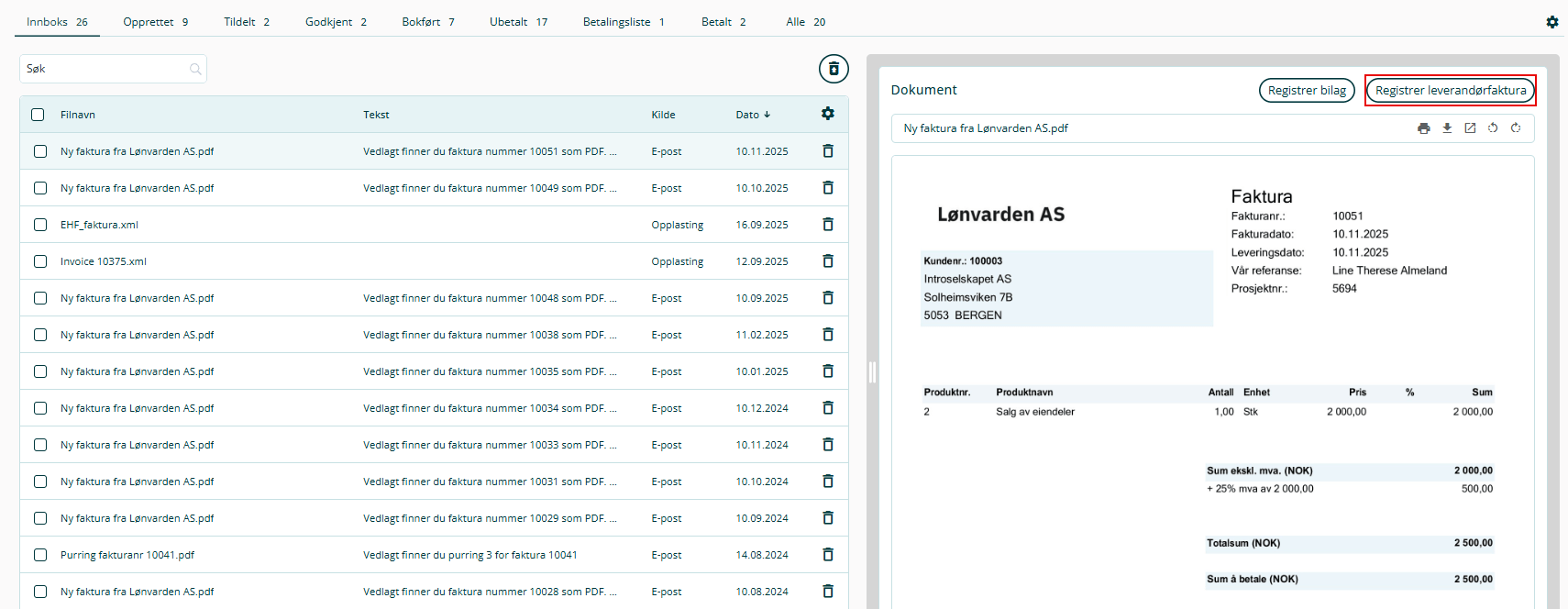 2. Velg aktuell faktura og klikk på Registrer leverandørfaktura. Når en faktura er opprettet, kan den også tildeles til andre brukere for godkjenning.