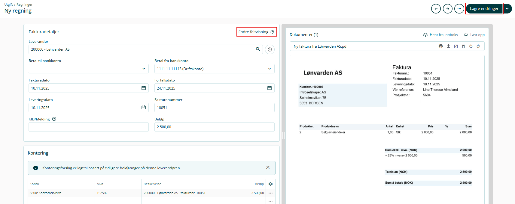 4. Klikk på Lagre endringer. Når en faktura er lagret, kan du bokføre den eller legge den til betaling.