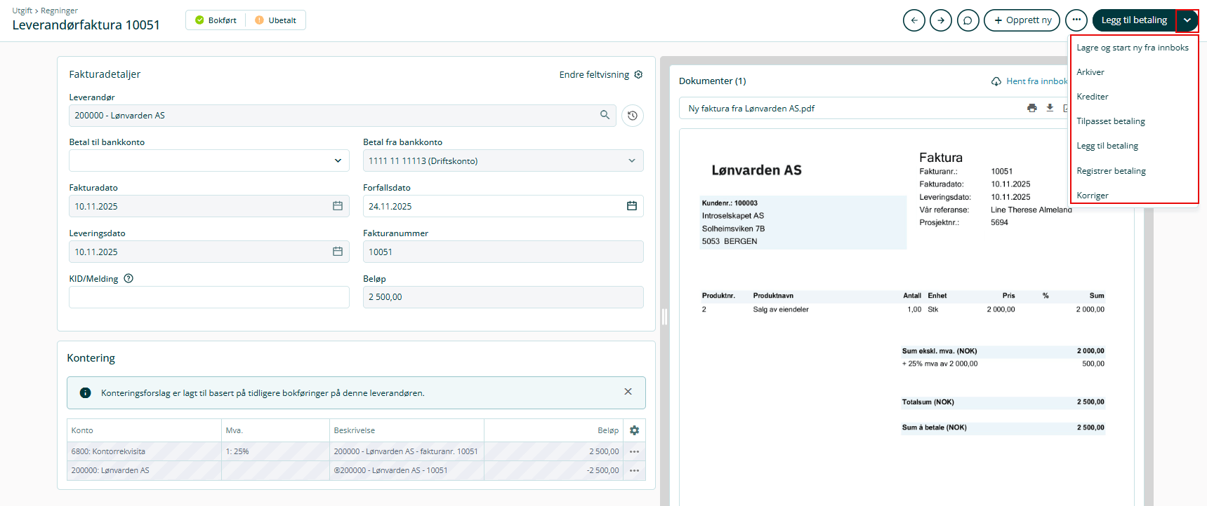 Ved å klikke på pilen får du også opp flere valg, blant annet kreditering eller korrigering av føringen. Hvis fakturaen allerede er betalt på andre måter (men vises som ubetalt), kan du klikke på Registrer betaling.