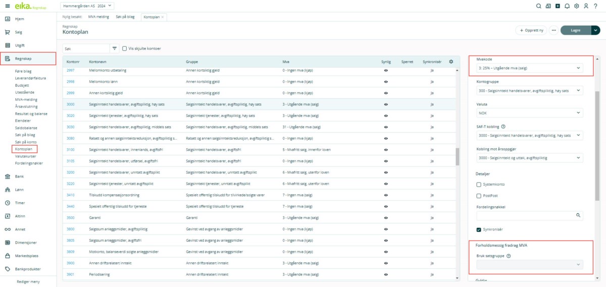 3. Nå kan du endre mva-kodene som er knyttet mot hovedbokskontoen. Du kan også knytte hovedbokskonto mot eventuelle grupper for forholdsmessig mva.
