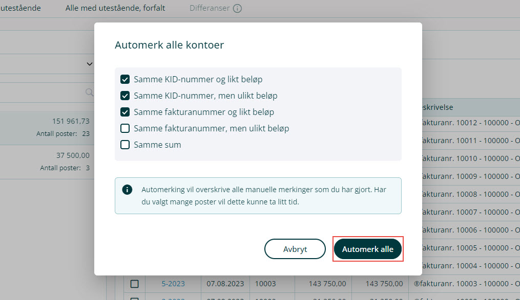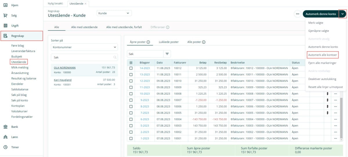 Du kan automerke åpne poster i alle kontoer i systemet. Alle poster som matcher kriteriene du har valgt vil automatisk lukkes. Vær oppmerksom på at dette vil gjøres for alle reskontroserier, kunder, leverandører og eventuelt andre serier, og ikke bare den valgte serien.
