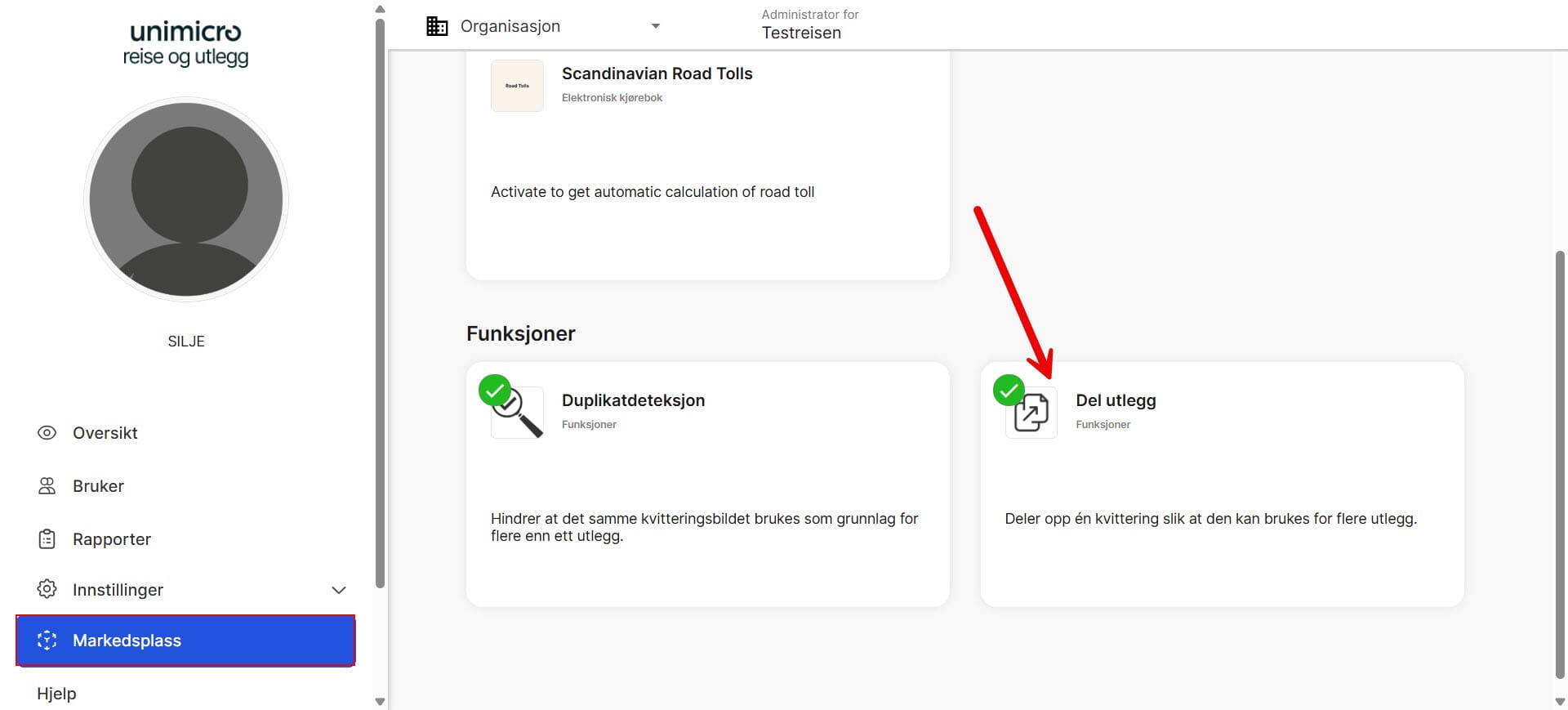 Gå til Markedsplass i venstremenyen, bla ned til du ser funksjonen Del utlegg. Klikk på funksjonen og aktiver den.