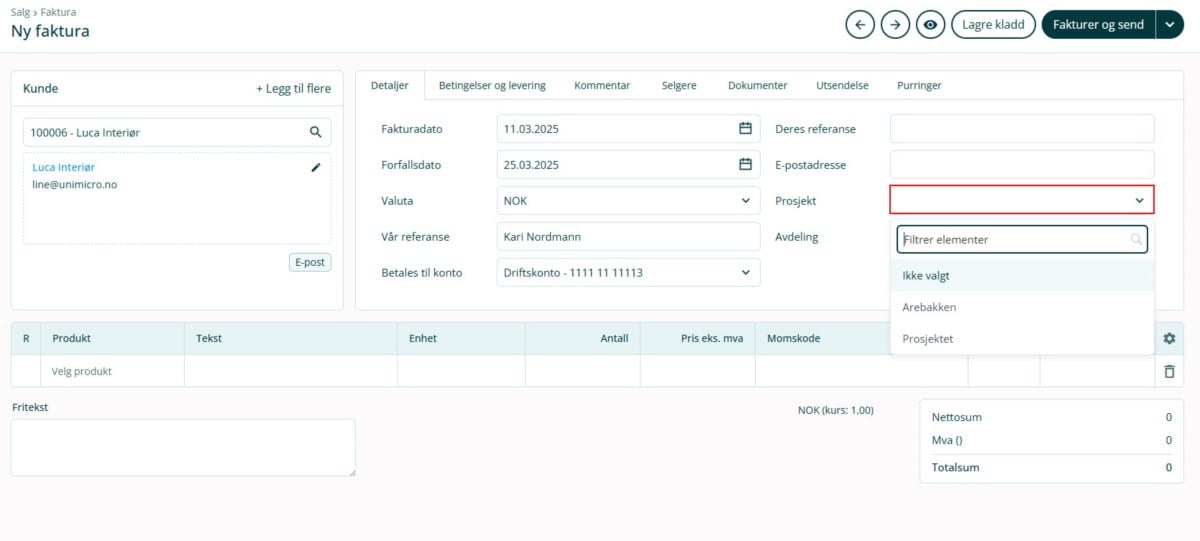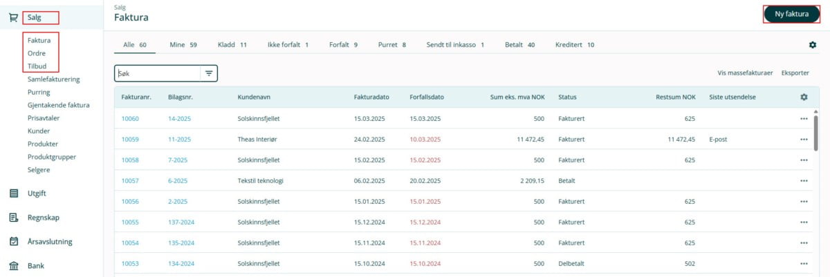 1. Gå til Salg i venstremenyen og velg Faktura, Ordre eller Tilbud. Opprett en faktura, ordre eller et tilbud
