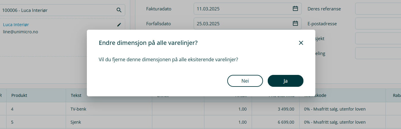 Legge til dimensjon direkte i faktura, ordre eller tilbud