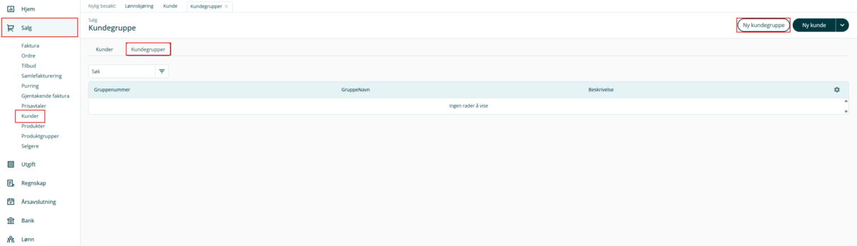 1. Gå til Salg i venstremenyen og velg Kunder. Klikk på fanen Kundegrupper, og Ny kundegruppe.