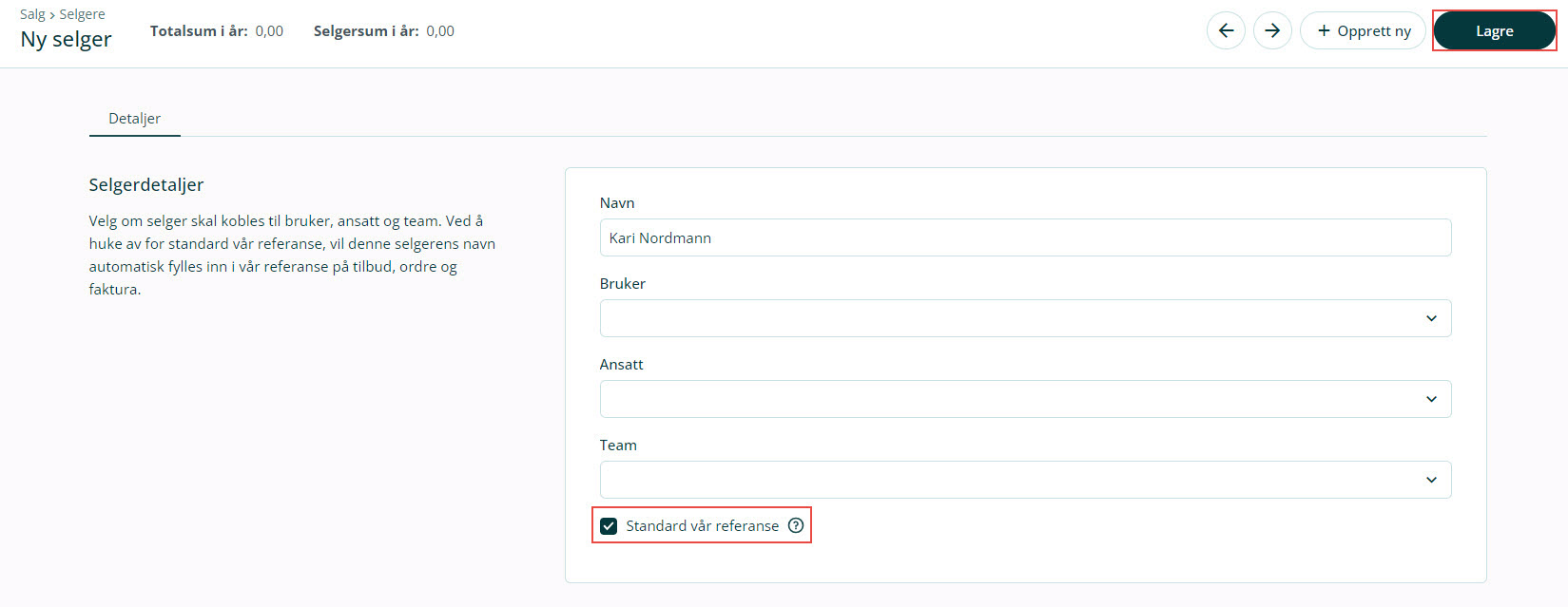 3. Sett hake ved Standard vår referanse dersom du ønsker at den aktuelle selgeren skal stå som referanse på alle tilbud/ordre/faktura på dette selskapet. Selgeren vil da foreslås som referanse hver gang faktura opprettes, til tross for at det er en annen bruker som fakturerer.