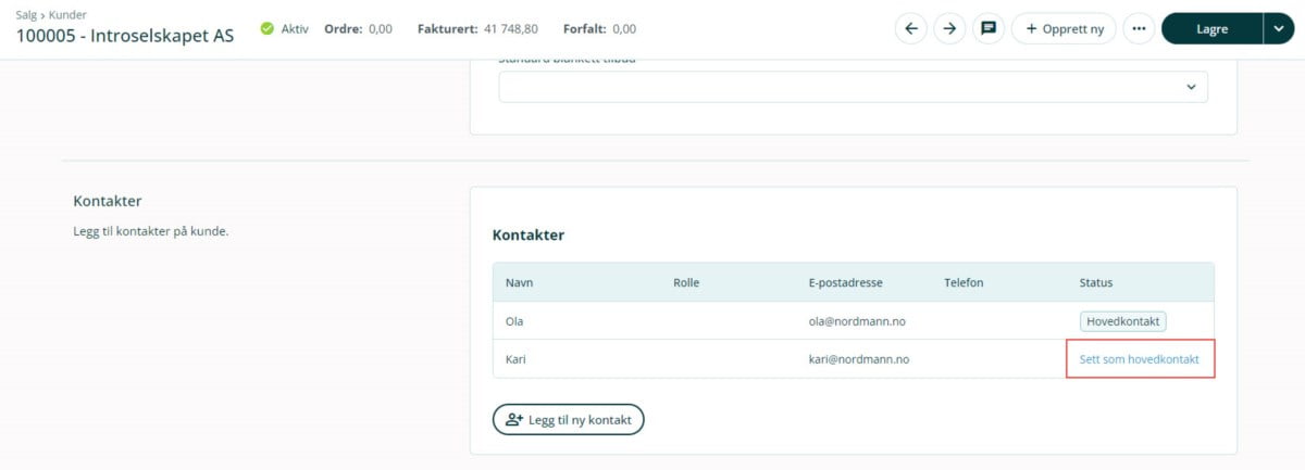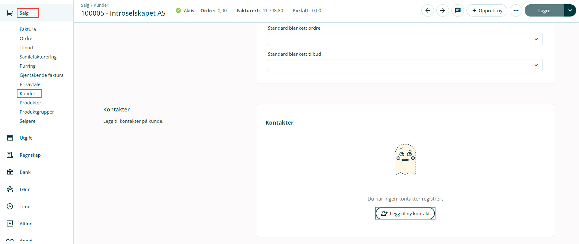 1. Gå til Salg i venstremenyen og velg Kunder. Velg aktuell kunde, bla ned til Kontakter og klikk på Legg til ny kontakt.