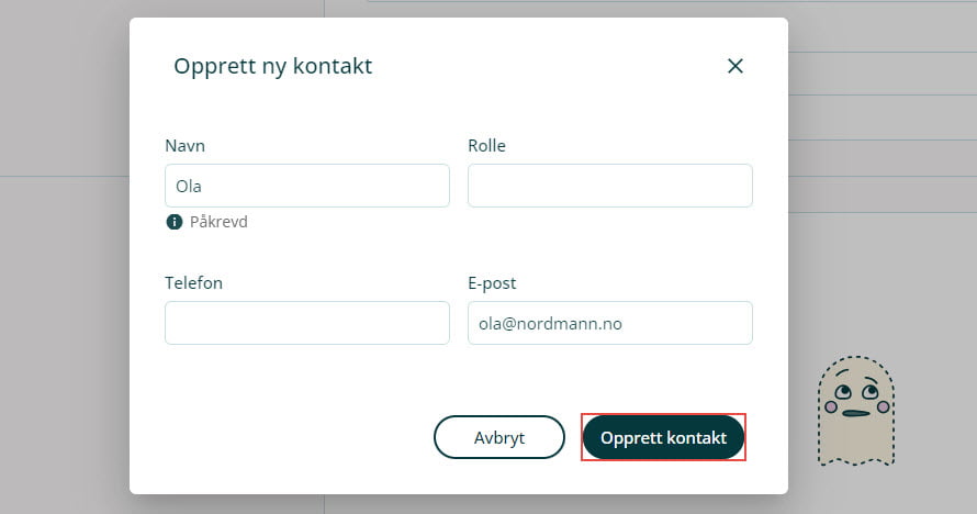 2. Fyll ut dialogvindu. Merk at Navn er et obligatorisk felt. Klikk på Opprett kontakt. Første kontakt du legger til får automatisk status som Hovedkontakt.
