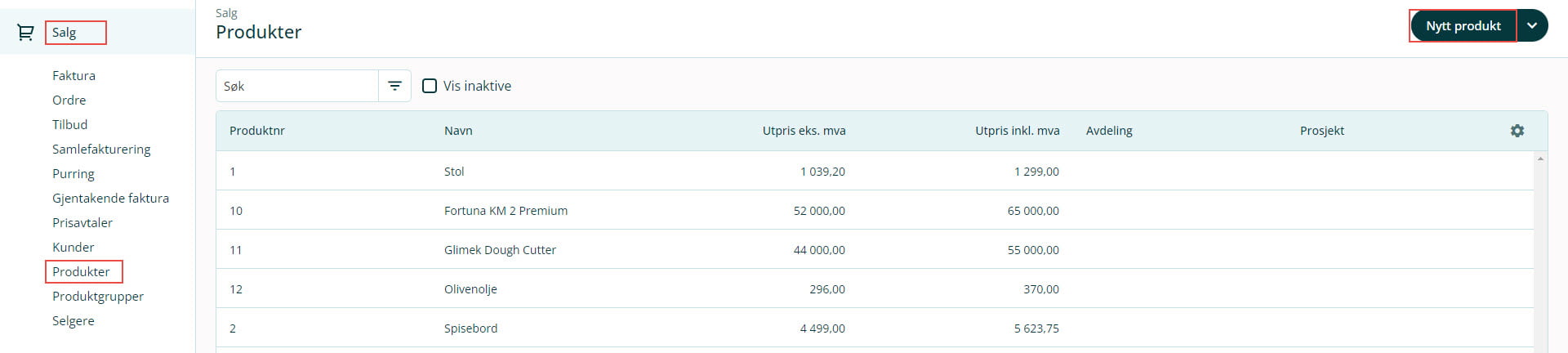1. Gå til Salg venstremenyen, velg Produkter og Nytt Produkt dersom du ønsker å koble et nytt produkt mot en timeart. Dersom produktet du ønsker å koble allerede eksisterer, kan du se bort fra dette steget.