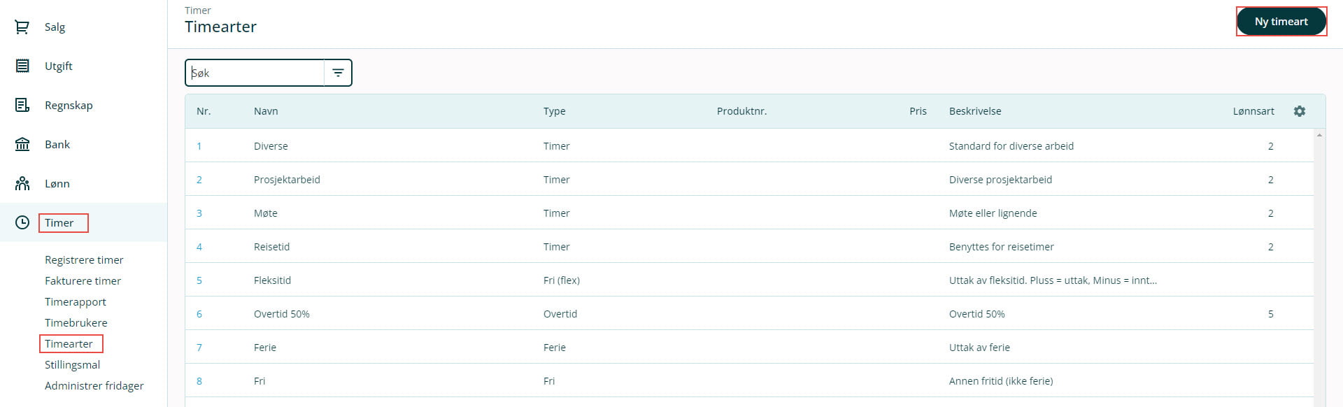 2. Gå til Timer i venstremenyen og velg Timearter. Velg aktuell timeart eller klikk på Ny timeart dersom du ønsker å koble produktet mot en helt ny timeart.