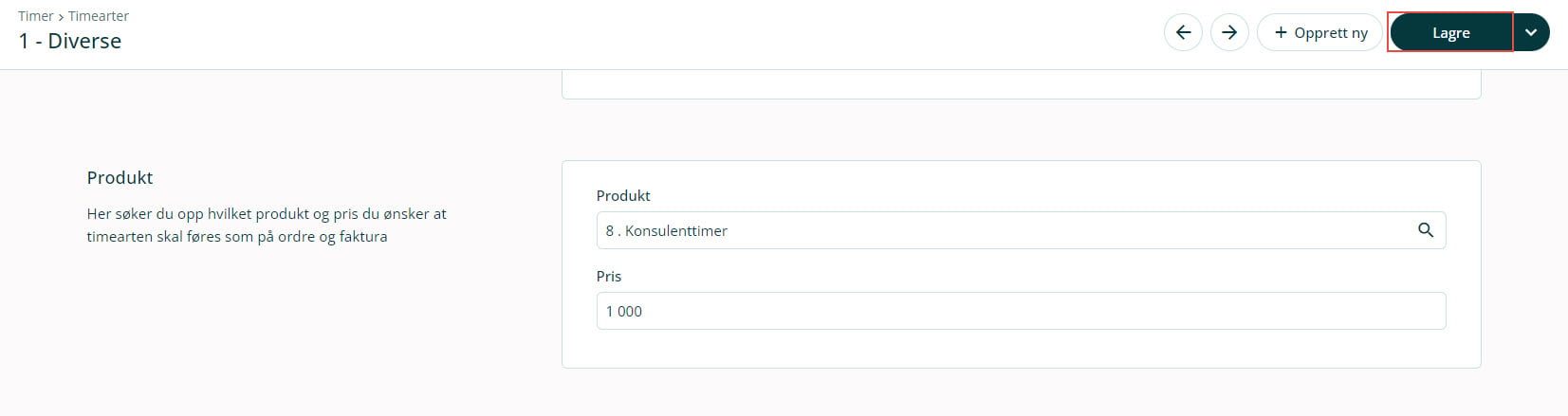 NB! Merk at prisen du setter på produktet inne på timearten er ekskludert merverdiavgift, og vil overstyre prisen du tidligere har angitt på produktet.
