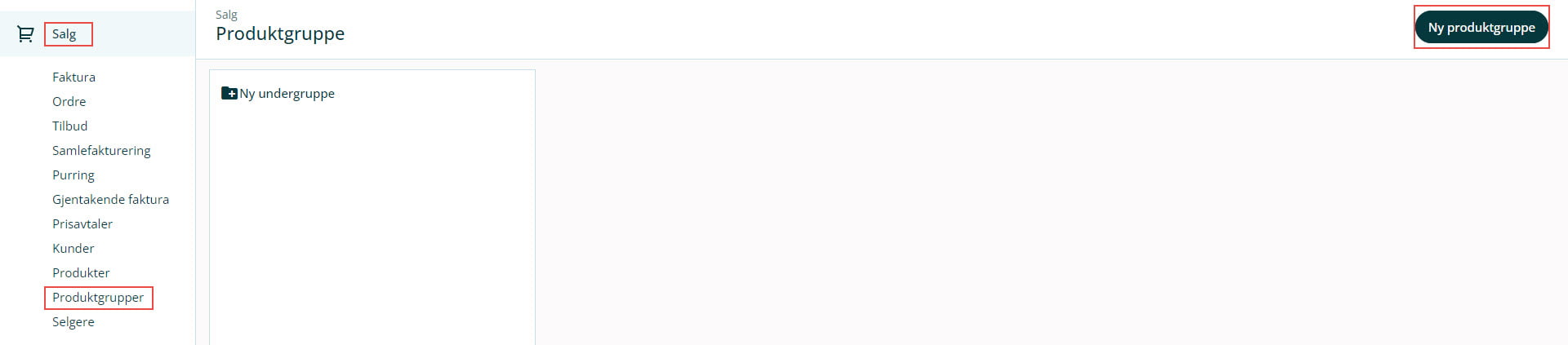 1. Gå til Salg i venstremenyen og velg Produktgrupper. Klikk på Ny produktgruppe.