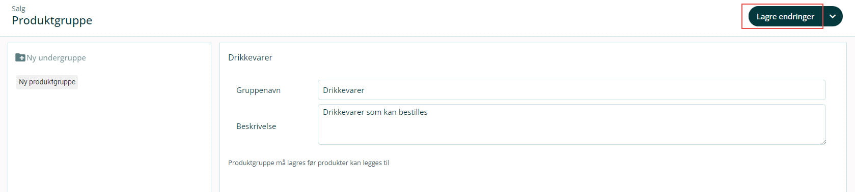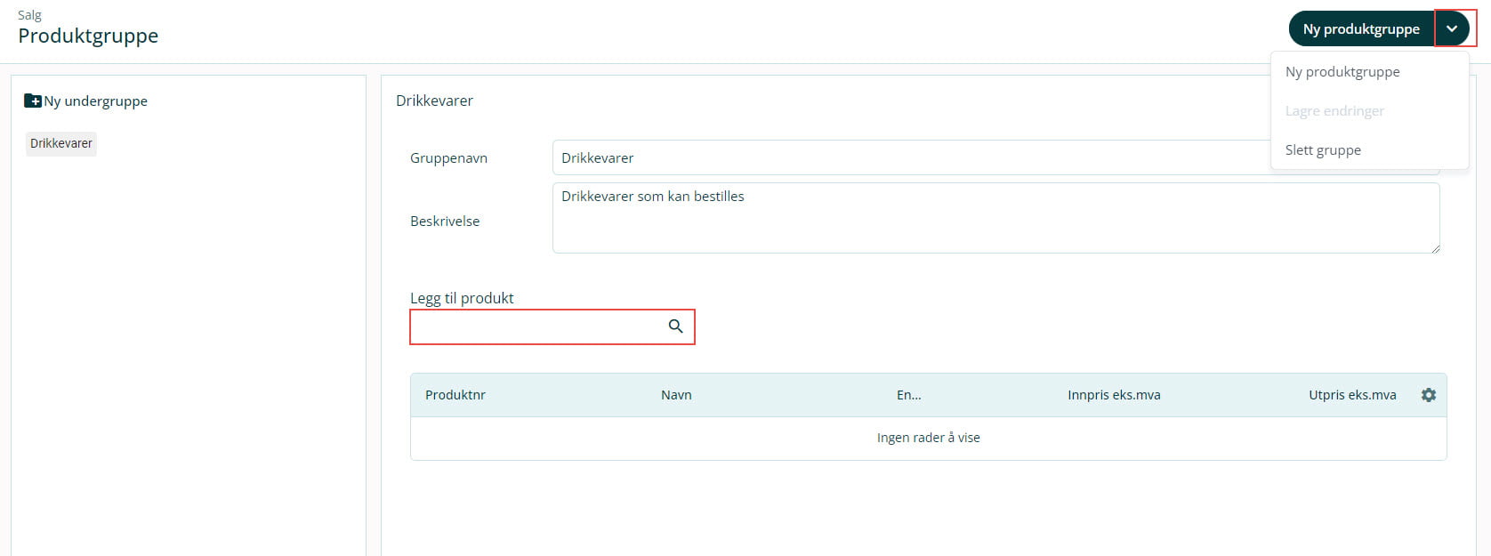 4. Klikk på nedtrekkslisten til høyre for Ny produktgruppe og velg Slett gruppe for å slette produktgruppen. Dersom du gjør endringer på Gruppenavn eller Beskrivelse vil knappen Lagre endringer bli tilgjengelig.