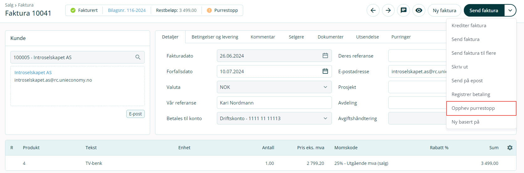 3. Klikk på Opphev purrestopp i nedtrekkslisten for å oppheve purrestopp på faktura.