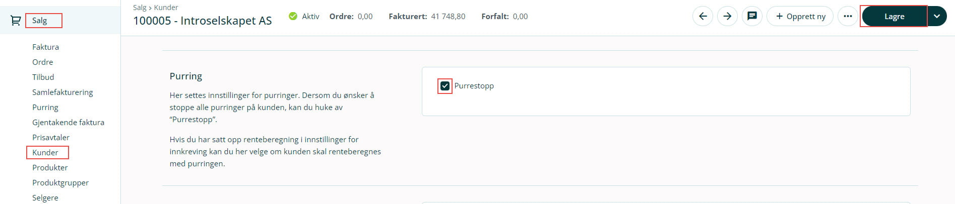 2. Bla ned til feltet Purring, klikk på Aktiver purrestopp og Lagre.