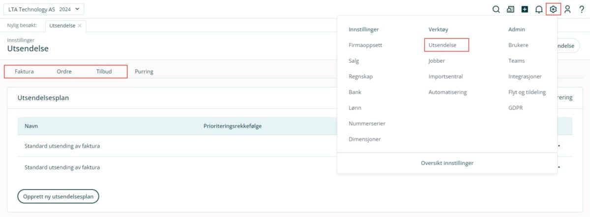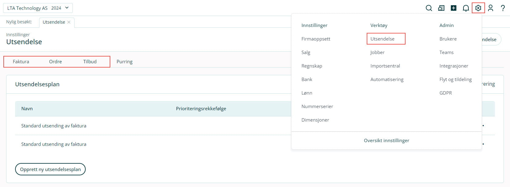 1. Gå til Innstillinger i toppmenyen og velg Utsendelse. Velg aktuell fane (Faktura, Ordre, Tilbud)
