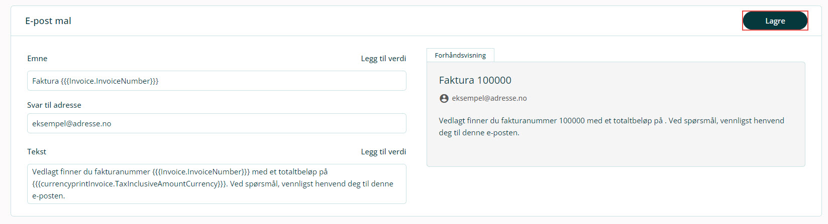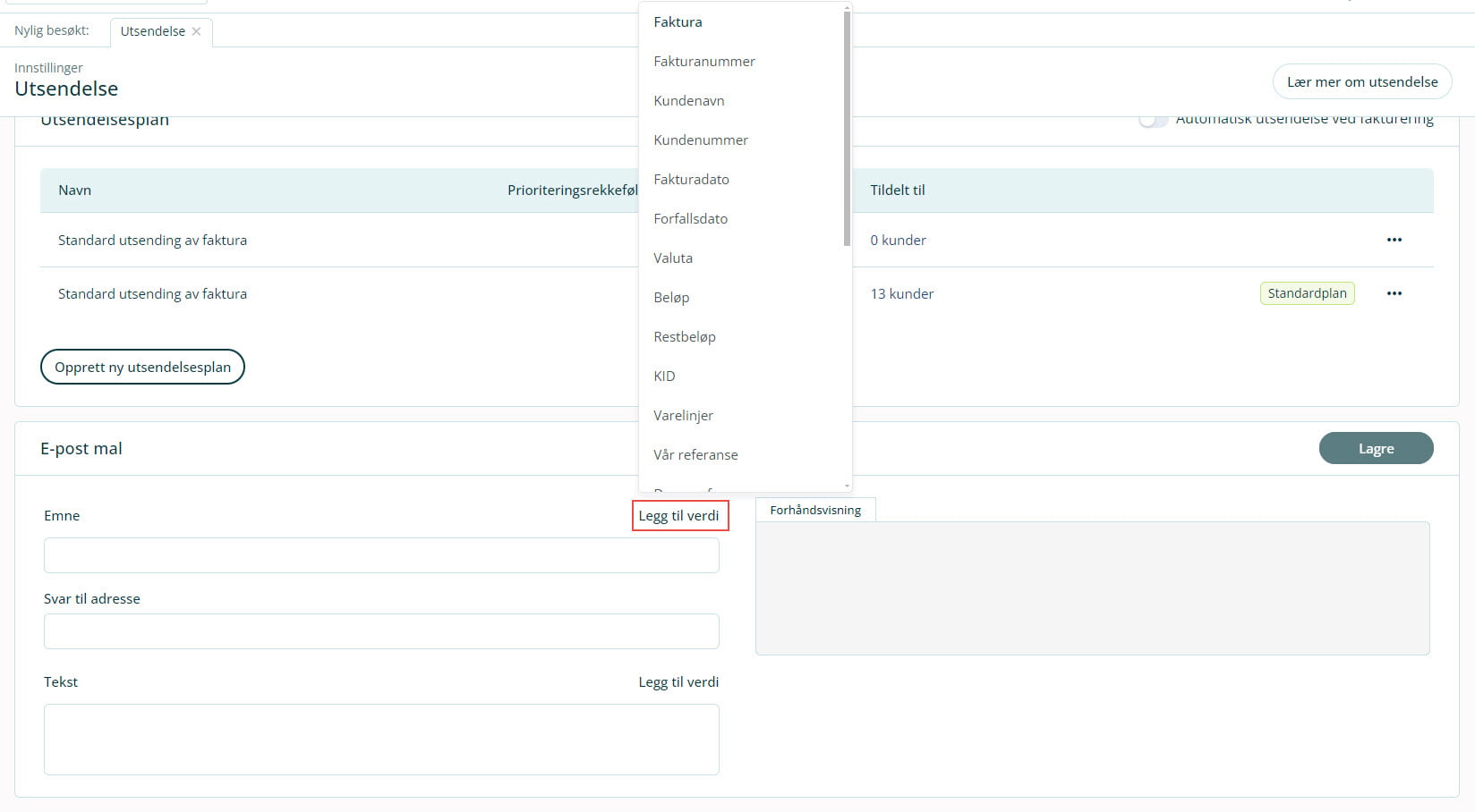 2. Bla ned til feltet E-post mal. Legg inn emne og velg Legg til verdi for å legge til en spesifikk verdi systemet skal autogenerere ved utsending. Legger du til fakturanummer som verdi, vil systemet alltid generere aktuelt fakturanummer i emneteksten for utsending.
