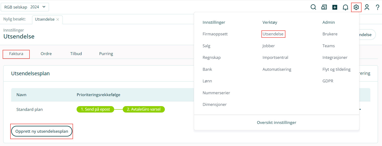 1. Gå til Innstillinger i toppmenyen og velg Utsendelse. Velg fanen Faktura og klikk på Opprett ny utsendelsesplan.