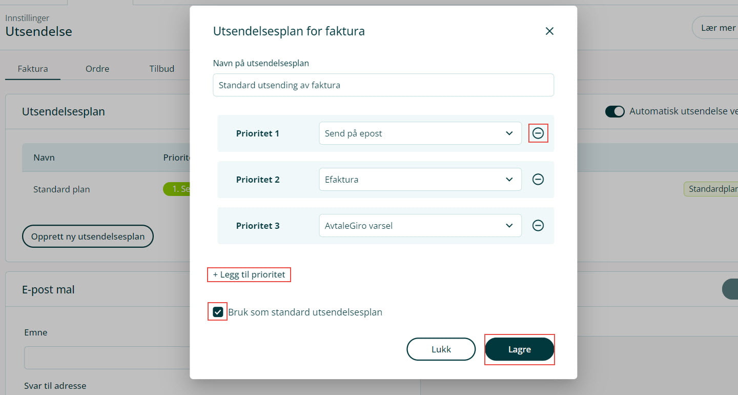 2. Sett navn på utsendelsesplanen. Klikk i feltet tilhørende Prioritet x for å velge utsendelsesmetode. Klikk på knappen til høyre for feltet for å slette prioritet.