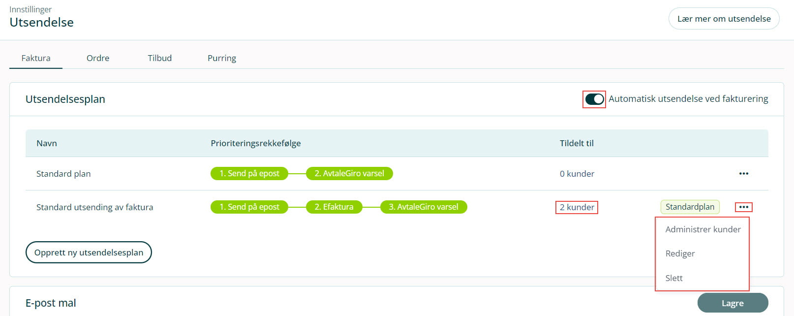 5. Aktiver Automatisk utsendelse ved fakturering dersom du ønsker dette. Da vil fakturaen sendes automatisk når du klikker på Fakturer og send i fakturabildet. Klikk på de tre kulepunktene på aktuell utsendelsesplan for å få frem diverse redigeringsmuligheter.
