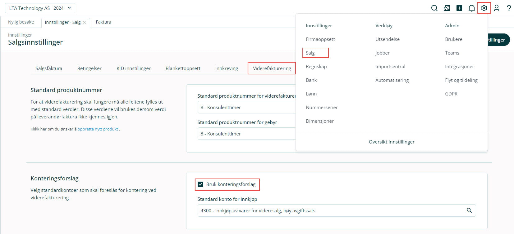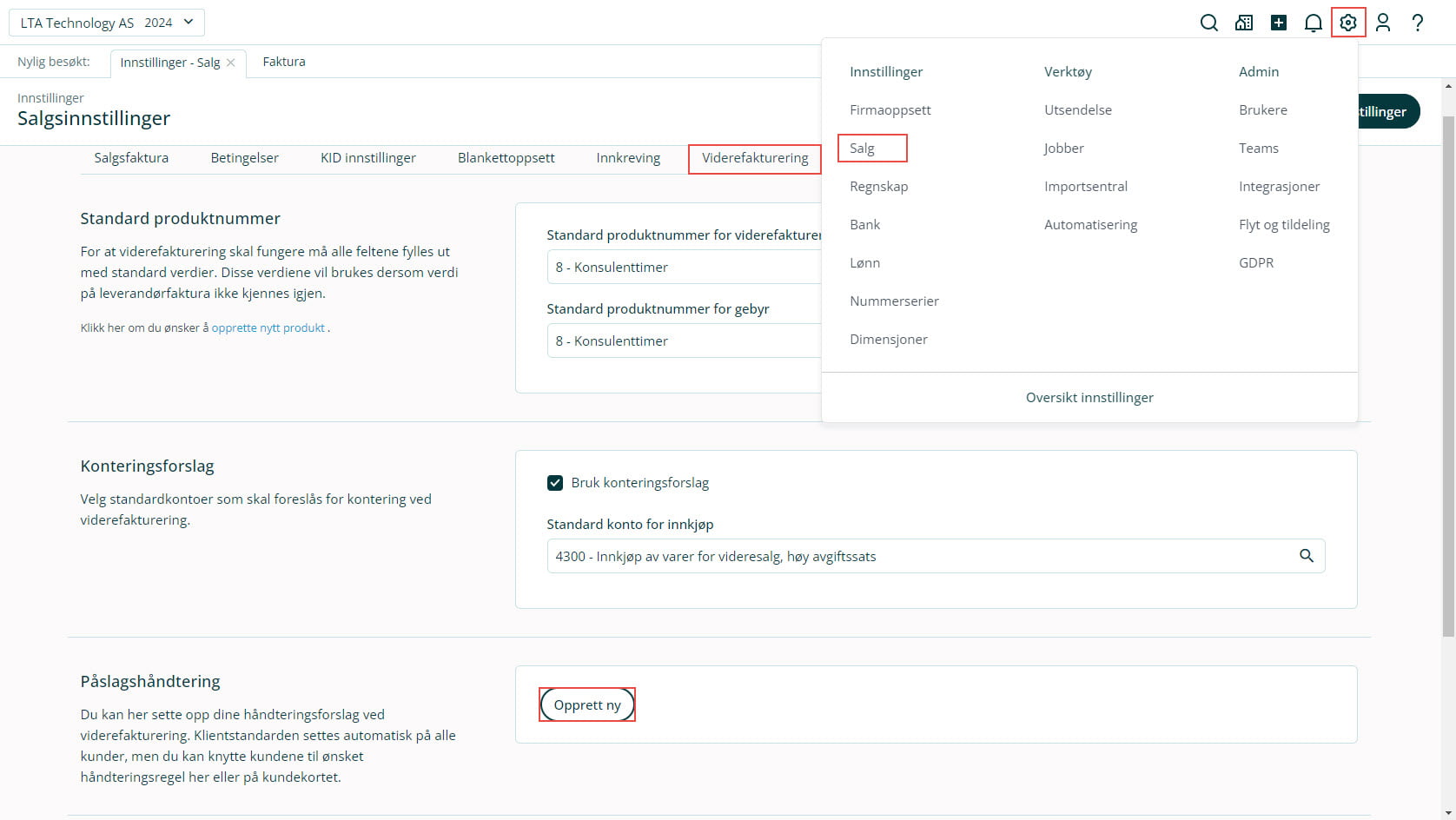 1. Gå til innstillinger i toppmenyen og velg Salg. Klikk på Viderefakturering.