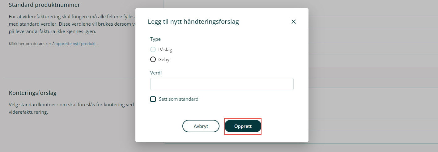 4. Sett prosentsats for påslag, eller fastpris for gebyr i feltet under Verdi. Sett hake ved Sett som standard dersom du ønsker at avtalen skal være standard på alle kunder. Klikk på Opprett.
