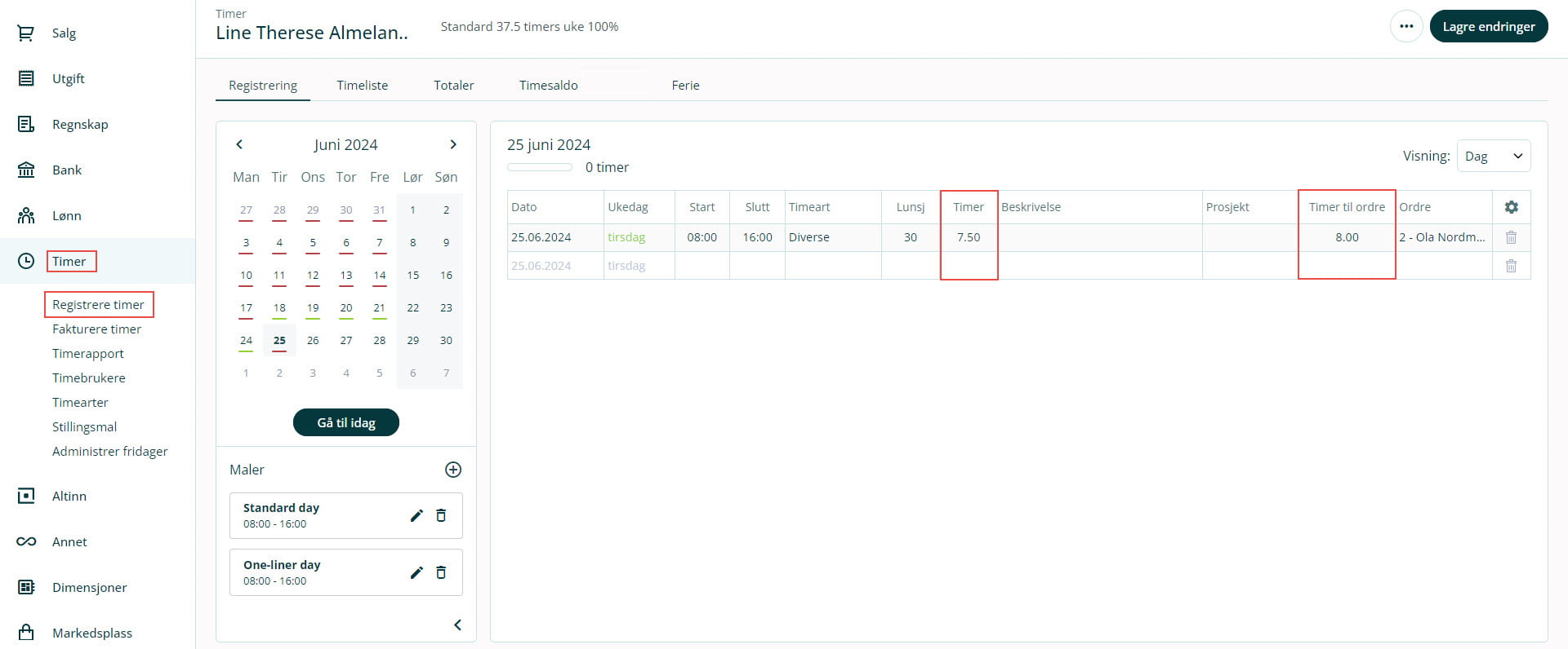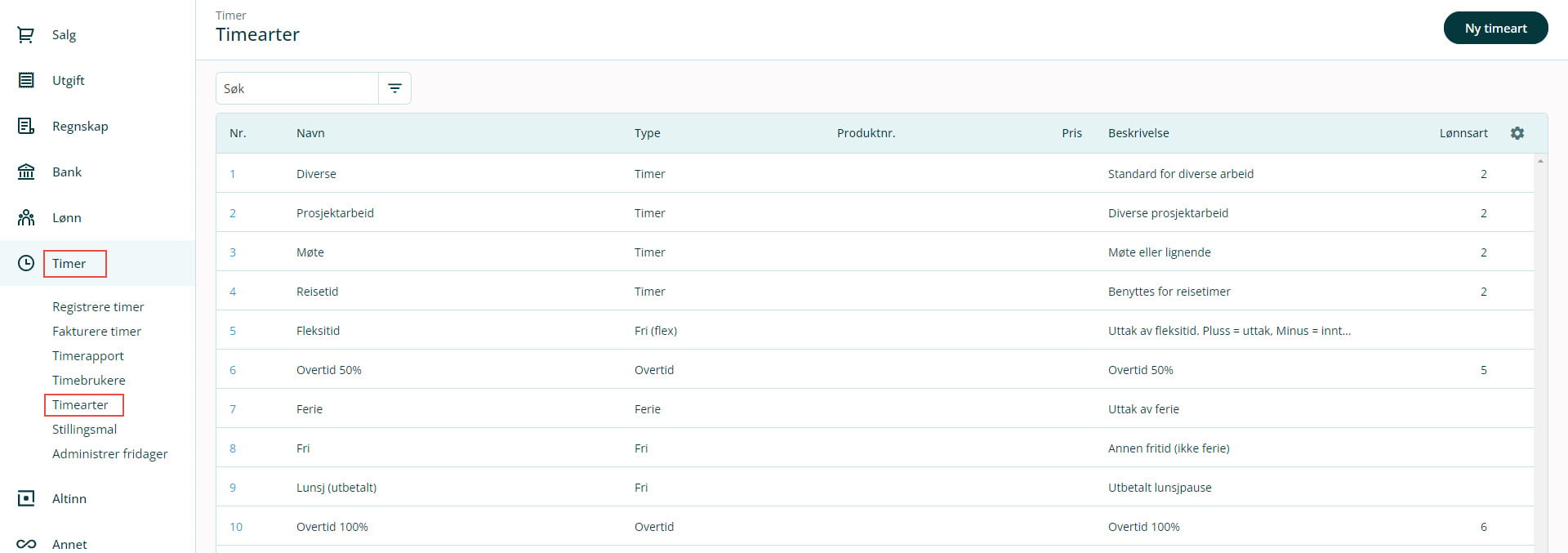 1. Gå til Timer i venstremenyen og velg Timearter. Hent frem den timearten du ønsker å aktivere opprunding av timer på.