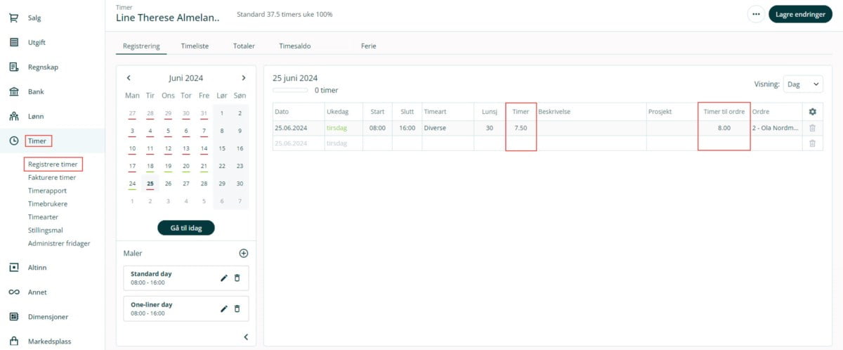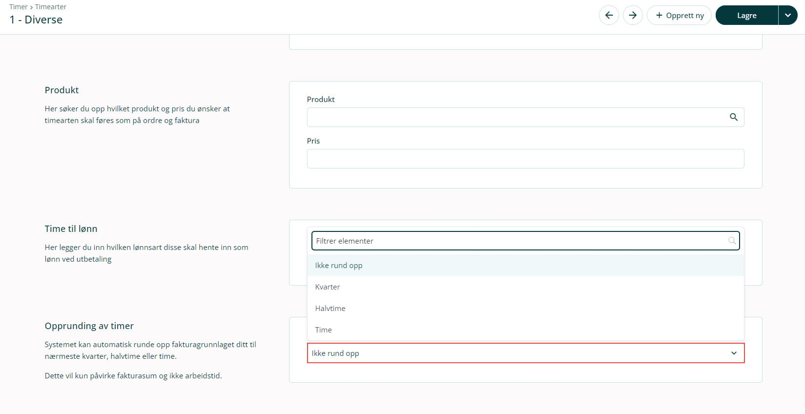 Merk at opprundingen kun påvirker timer til ordre som faktureres, og ikke den faktiske registrerte tiden under Timeregistrering.