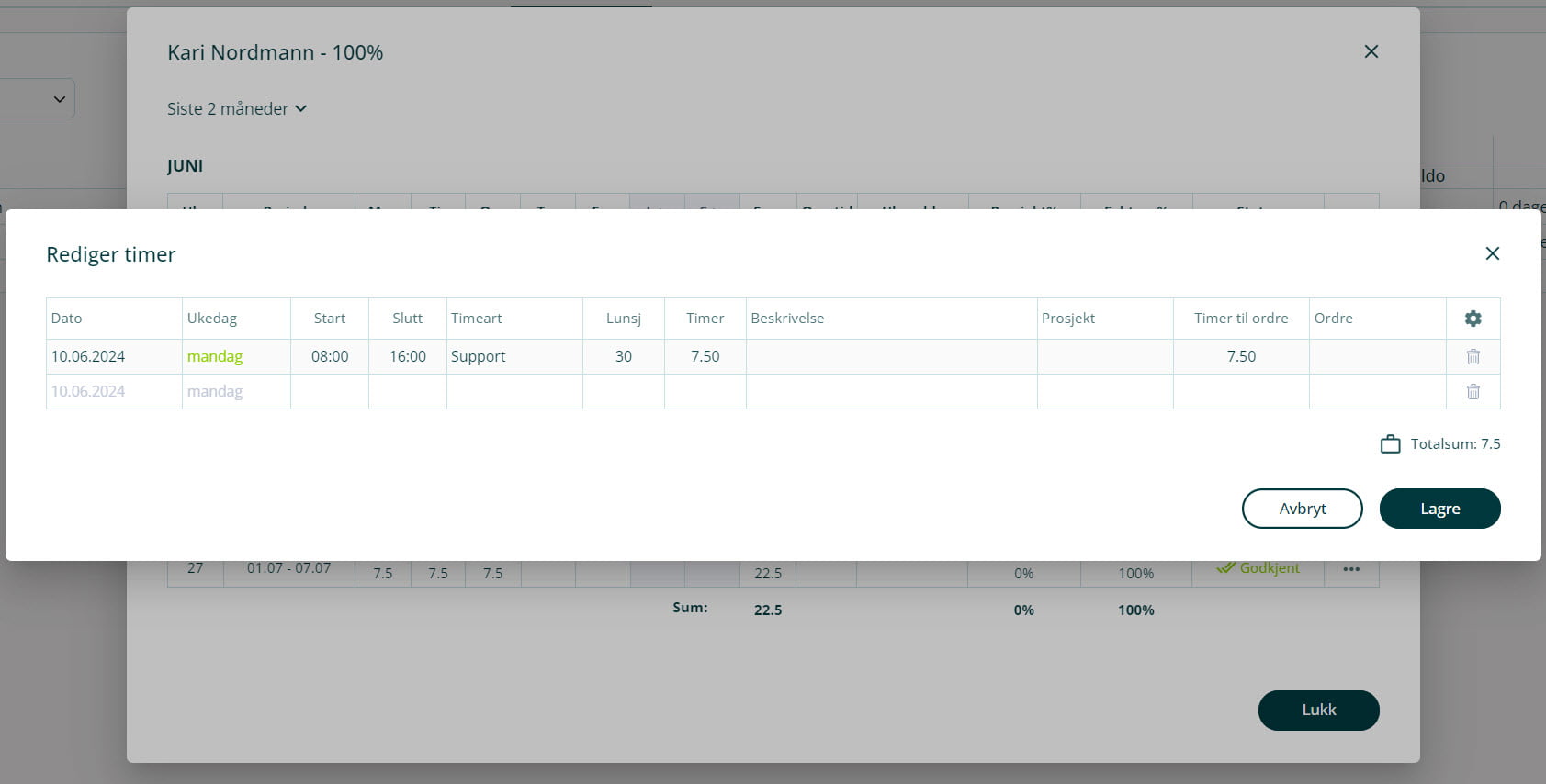 Det finnes to måter å godkjenne timer på: Gjennom godkjenningsfunksjonen, eller direkte fra timeregistrering. Å godkjenne via godkjenningsfunksjonen er raskere, men via timeregistrering får du en mer detaljert visning med mulighet til å redigere registrerte timer.